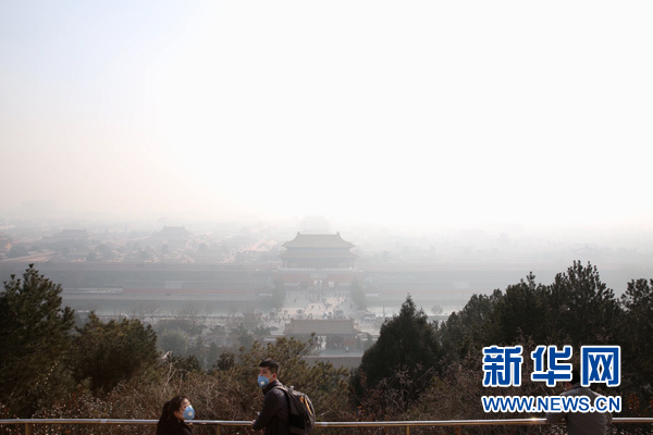 12月16日中午,游客在北京景山公园游览。当日20时,北京市预警中心、北京市空气重污染应急指挥部办公室启动了今年首个“空气重污染红色预警”新华社记者 金立旺摄