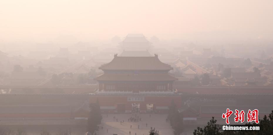 12月18日,雾霾中的紫禁城。从12月16日开始,北京遭遇今冬以来最严重的区域性空气重污染过程,预计持续时间超过5天。对此,北京市空气重污染应急指挥部于12月15日提前发布今年首个空气重污染红色预警,12月16日20时启动各项应急措施,其中包括机动车单双号行驶(电动车除外)、中小学及幼儿园采取弹性教学或停课等。中新社记者 韩海丹 摄