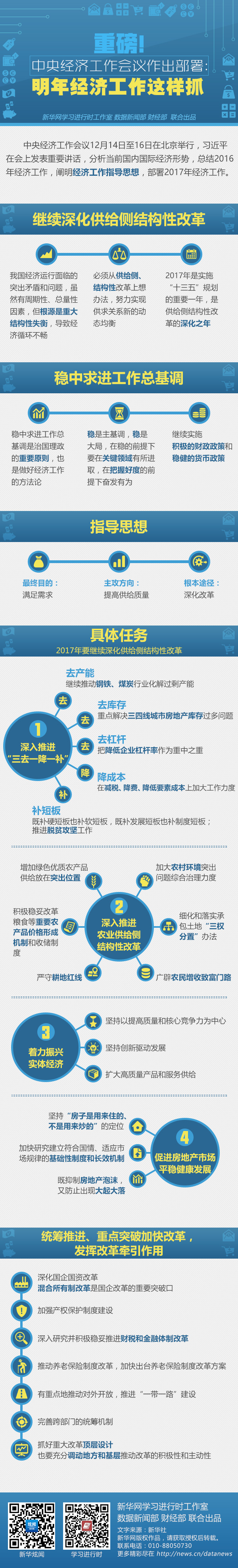 “2017年是供给侧结构性改革的深化之年”“坚持以推进供给侧结构性改革为主线”。中央经济工作会议释放了把深化供给侧结构性改革作为明年工作重点的明确信号,作出了系统部署。从“攻坚之年”到“深化之年”,从“三去一降一补”五大任务拓展为四个方面重点工作,以习近平同志为核心的党中央把握发展规律、顺应实践要求,为供给侧结构性改革注入新内涵、擘画新图景,为做好经济工作提供了科学指南。