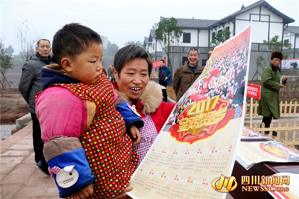 村民领取挂历后,向记者展示。
