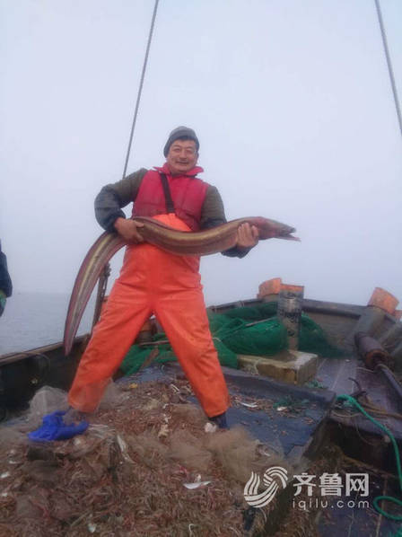19日上午在山东蓬莱市避风港码头,有渔民捕捞到了一条超级大的狼牙鳝。记者赶到码头时,很多人都围在捕捉到大鱼的摊位前,看摊主闫庆禄为大家展示这条大鱼。随后,闫庆禄又用尺现场测量这条鱼的长度。这条狼牙鳝从头到尾长度有1.86米,重量达到了26斤,最粗的地方有38厘米。