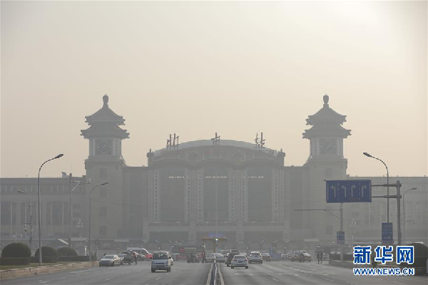 12月18日拍摄的雾霾中的北京站。新华社记者 程婷婷 摄