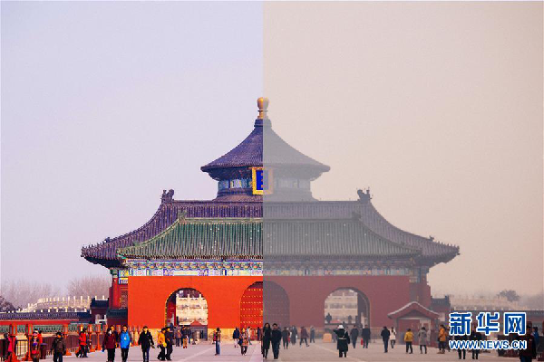 图为12月17日上午拍摄的北京天坛公园;右图为12月17日下午拍摄的北京天坛公园(拼版照片)。新华社记者 刘金海 摄