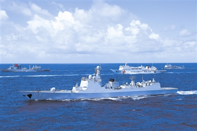 上图:“环太平洋-2016”演习中,我海军导弹驱逐舰西安舰与综合补给舰高邮湖舰、和平方舟医院船、综合援潜救生船长岛船组成的舰艇编队正在进行演练。本报特约记者 李唐 摄