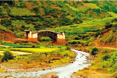 汽车随着蜿蜒的江水,在长新乡停了下来,隔江相望的小村正中,一座瓦顶木结构的古桥横跨沘江。这就是赫赫有名的“通京桥”,大理境内留传至今的同类桥梁中,跨度最大的古桥。