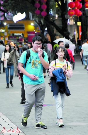 昨日冬至虽至,但高达25摄氏度的气温,让街上的行人找不到冬天的感觉。 广州日报记者黎旭阳 摄