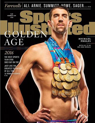 近日,菲尔普斯作为《体育画报》今年最后一期的封面人物进行了拍摄,这一次和他一同亮相的还有他获得的28枚奥运奖牌。虽然28枚奖牌都有亮相,但封面图选了23枚金牌,这是菲尔普斯首次将这些金牌一起戴在脖子上。