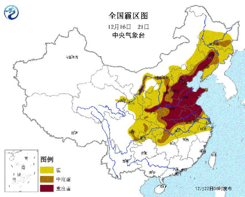 12月16日至21日,中国中东部地区经历了今年范围最广、持续时间最长、强度最强的一次霾天气过程。华北、黄淮及其周边共13个省(市、区)出现重度霾,霾影响区域面积达到268万平方公里,超过中国四分之一的国土面积。截至22日,华北、黄淮等地的霾天气已经明显减弱或消散。
