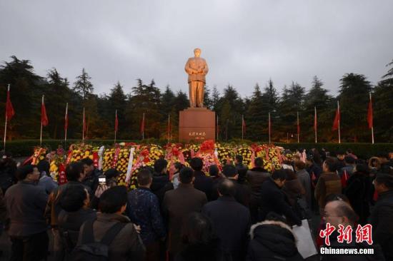 12月26日,众多民众来到湖南韶山毛泽东广场同唱《东方红》,向毛泽东铜像行鞠躬礼、敬献花篮,纪念毛泽东诞辰123周年。杨华峰 摄