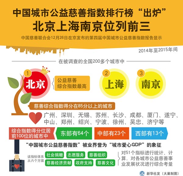 图表:中国城市公益慈善指数排行榜“出炉” 北京上海南京位列前三 新华社发 大巢制图
