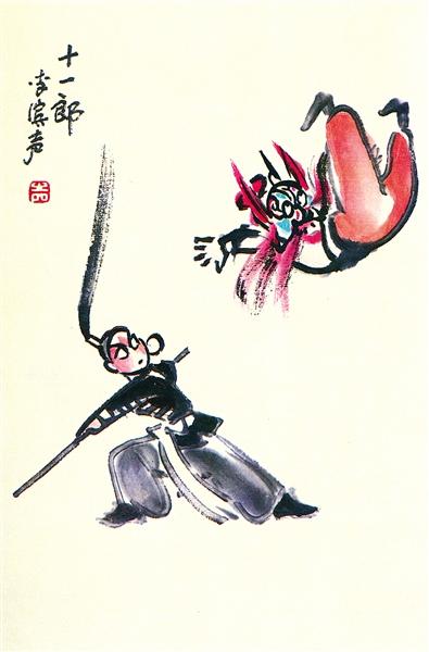 李滨声的画把十一郎误打许世英的神态和青面虎怒目圆睁的窘态形象地展示在画上。