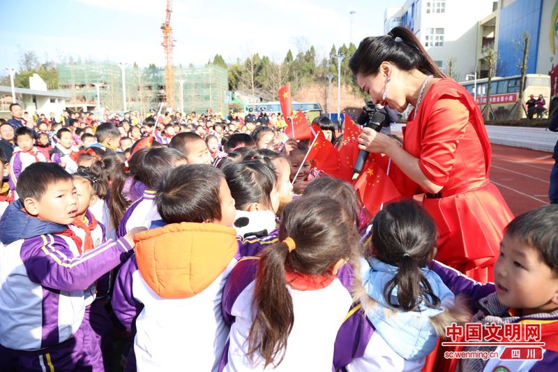 四川省歌舞剧院歌手王胜英刚走下舞台,就被孩子们团团围住,并送上了手中的小国旗。