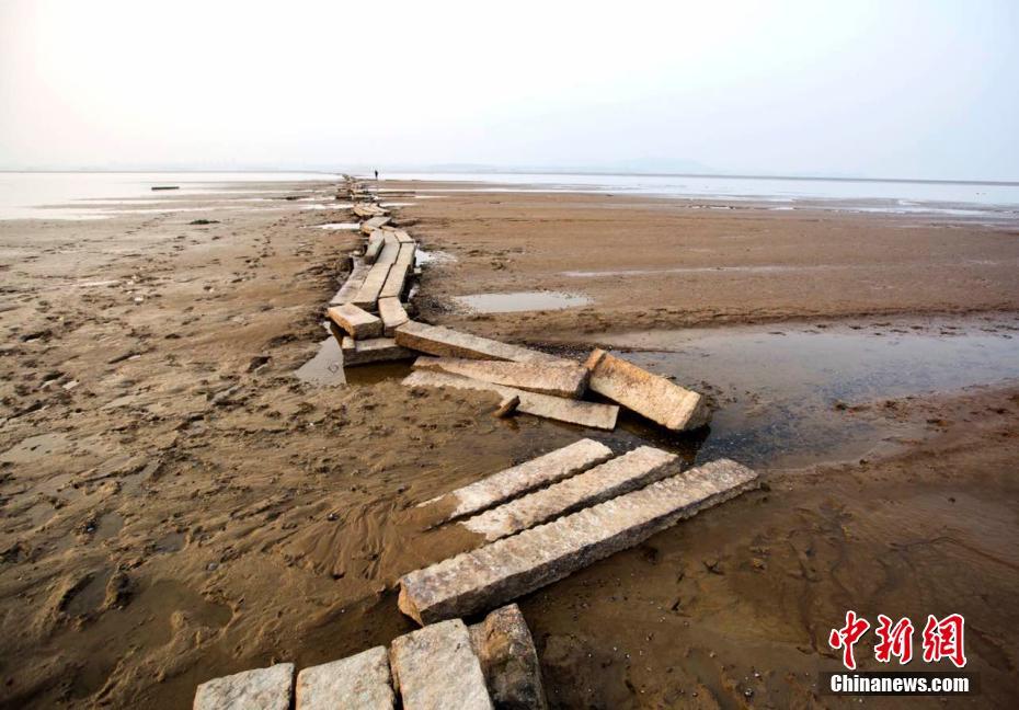 近日,在中国最大淡水湖鄱阳湖湖床上静静躺了数百年,始建于明代的古石桥“千眼桥”迎来历史上首次大修。“千眼桥”位于鄱阳湖都昌县多宝乡至庐山市的湖床上。鄱阳湖丰水季节浩瀚万顷,水天相连;枯水季节水落滩出,枯水一线。近年来,当鄱阳湖水位下降至枯水位时,石桥就会露出水面,成为当地一景。图为“千眼桥”远处依稀可见城市的轮廓。 中新社发 傅建斌 摄