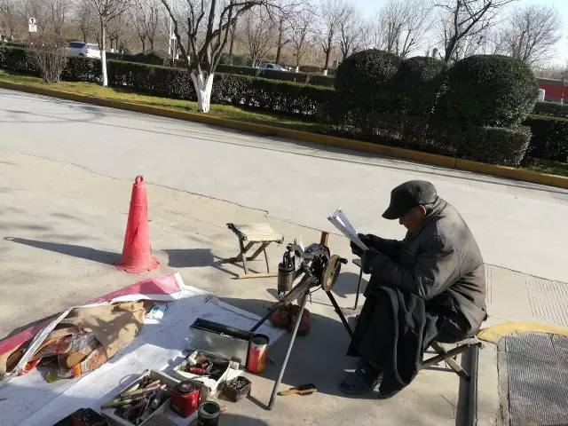 2016-12-27,陕西省西安市。培华学院门口的修鞋匠在寒风中认真看书。作者:小骆