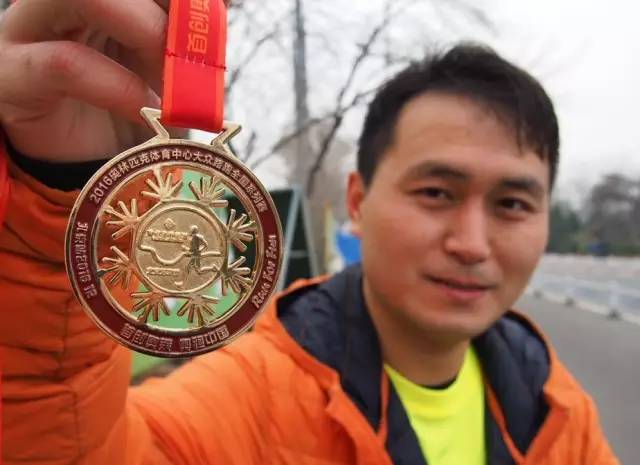 2016-12-25,北京奥体中心。一位参加圣诞城市跑的参与者展示奖牌。作者:雨亦奇