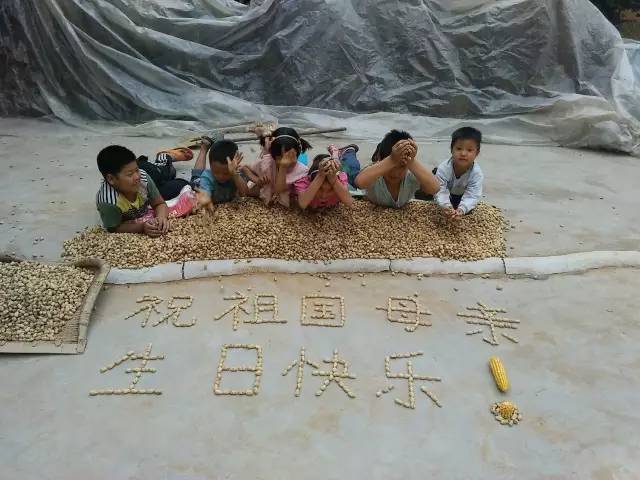 2016-10-01,河南鲁山县。乡村的谷场上,孩子们用收获的花生摆出字样。作者:乡间艾蒿