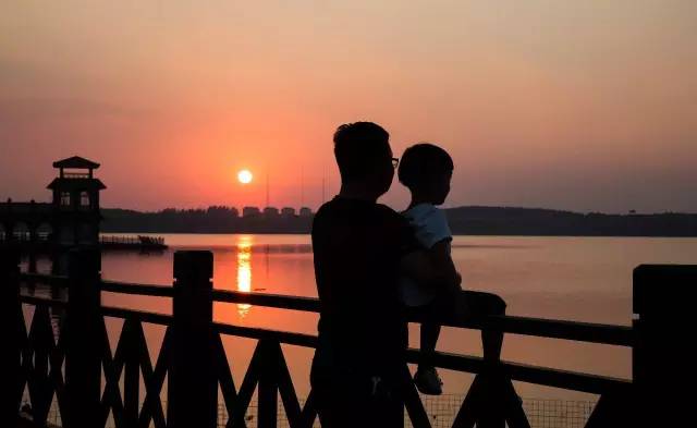 2016-06-19,江西九江。父亲护着坐在护栏上的孩子,一起欣赏夕阳。作者:宋晨