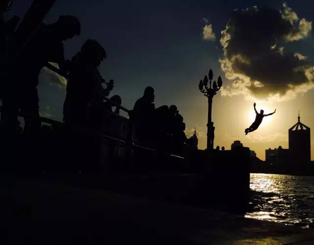 2016-10-01,青岛。栈桥边,一位跳水爱好者在夕阳中跳入大海。作者:陈三郎