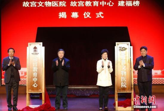 12月29日,故宫文物医院、故宫教育中心、“建福榜”揭幕仪式在北京故宫博物院报告厅举行。图为国家文物局局长刘玉珠(左一)、香港特别行政区政府政务司司长林郑月娥(左三)、故宫博物院院长单霁翔(右一)、故宫研究院院长郑欣淼(左二)出席揭幕仪式。 中新社记者 杜洋 摄