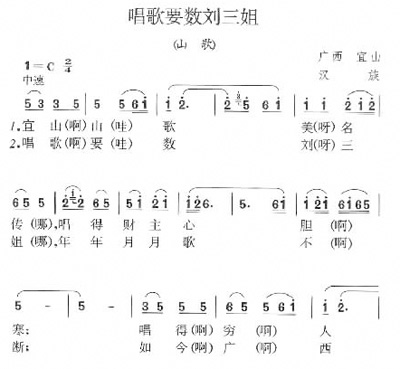 它的唱词为七言四句,全词以十分欣慰的口吻歌颂了刘三姐这位宜山姑娘的才华(关于刘三姐的故乡,民间说法很多,宜山是其中之一)。《唱歌要数刘三姐》的曲调共4个乐句,句幅较宽大,每句都在6个小节以上;各乐句再分作两个乐汇,前长后短,而且前一乐汇必有一个长音拖腔,强化了它的山野风格。如第一乐句前乐汇的拖腔停留在高音“Re”(2)上,有两拍之久,使这一乐汇的总长度达到4小节,而接下去的乐汇则仅为2小节,腔词密集,婉转流丽,十分动听。以下三个乐句基本上都是这种结构,它的主要特色是利用前乐汇的延长音突出其山歌味,用后面的密集歌腔来加强它的歌唱性。在各地山歌曲目中,这样的句式结构是较为少见的。