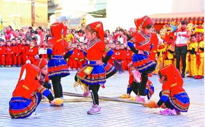 12月30日,广西罗城仫佬族自治县第二幼儿园里,小朋友们在音乐伴奏下跳起竹竿舞,以民族舞蹈迎接新年到来。