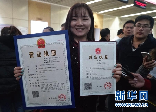 江西国道贵金属贸易有限公司法定代表人李霞在展示她领到的南昌市首张“三证合一”营业执照和副本(2015年3月26日摄)。两年多来,中央全面深化改革领导小组确定的181个重点改革任务基本完成,中央有关部门完成261个改革任务,各方面共出台改革成果785项。随着一项项改革措施密集出台,全面深化改革潮掀浪涌,奏出推动经济社会发展的时代强音。 新华社记者 陈子夏 摄