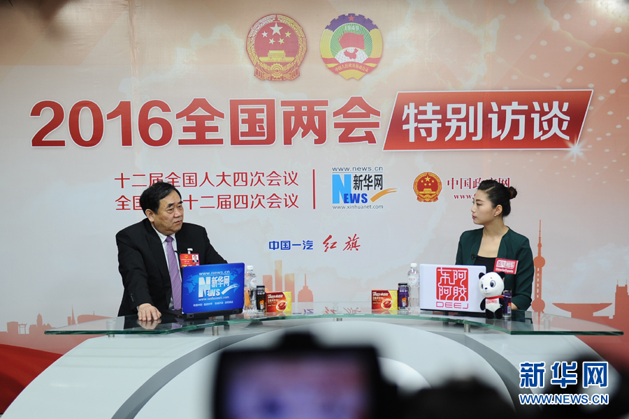 2016年3月3日,全国人大代表、济南圣泉集团股份有限公司董事长唐一林做客新华网两会访谈直播间,谈科技创新助推生物质石墨烯新材料研发。图为唐一林在访谈现场。新华网 贾海元 摄