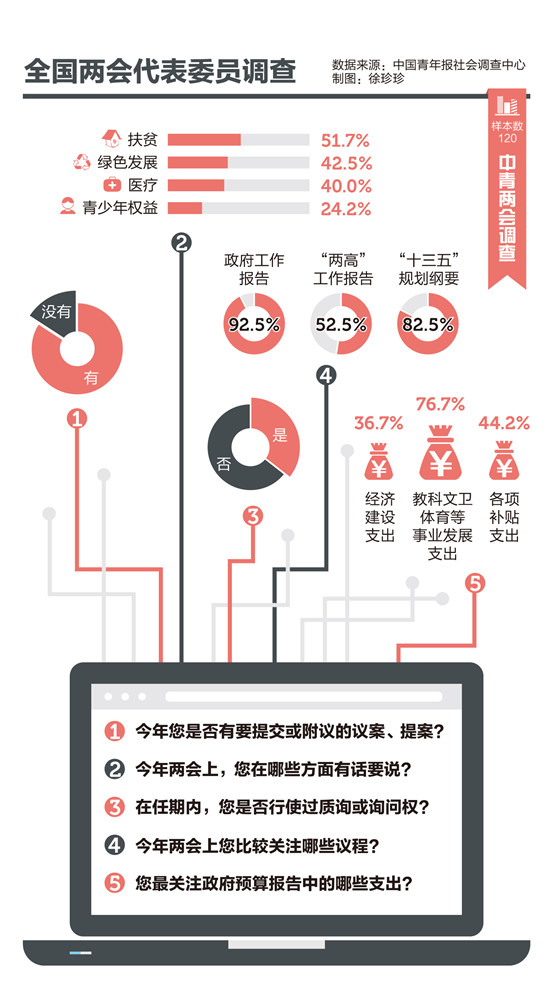 事实上,调查显示超过八成的代表委员准备了议案和提案,其中涉及的话题除了以往备受关注的养老(37.5%)、医疗(40%)、反腐(15.8%)、就业创业(30%)以外,扶贫(51.7%)、供给侧改革(21.7%)、青少年权益(24.2%)以及意识形态与文化建设(23.3%)也成为今年代表和委员们希望表达意见的领域。