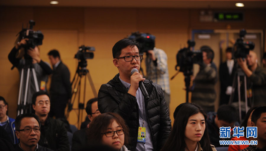 十二届全国人大四次会议新闻中心于3月7日(星期一)10时45分在梅地亚中心多功能厅举行记者会,邀请农业部部长韩长赋、新闻发言人叶贞琴就“转方式调结构 加快发展现代农业”的相关问题回答中外记者的提问。图为香港大公报记者提问 。新华网/中国政府网记者 陈杰 摄