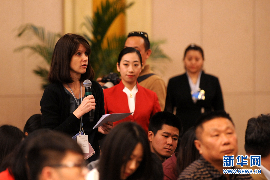 十二届全国人大四次会议新闻中心于3月8日(星期二)15时在梅地亚中心多功能厅举行记者会,邀请国家卫生和计划生育委员会主任李斌、副主任马晓伟和副主任王培安就“实施全面两孩政策”的相关问题回答中外记者的提问。图为华尔街日报记者提问。新华网/中国政府网记者 陈杰 摄