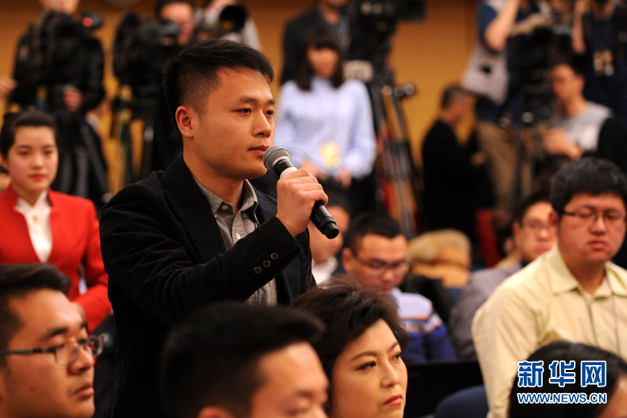 十二届全国人大四次会议新闻中心于3月8日(星期二)15时在梅地亚中心多功能厅举行记者会,邀请国家卫生和计划生育委员会主任李斌、副主任马晓伟和副主任王培安就“实施全面两孩政策”的相关问题回答中外记者的提问。图为中国日报社记者提问。新华网/中国政府网记者 陈杰 摄