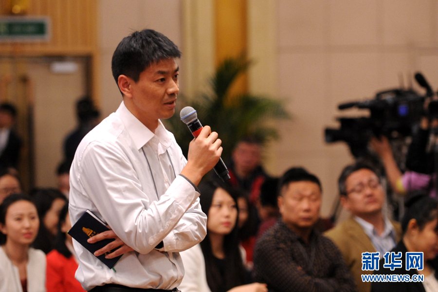 十二届全国人大四次会议新闻中心于3月8日(星期二)15时在梅地亚中心多功能厅举行记者会,邀请国家卫生和计划生育委员会主任李斌、副主任马晓伟和副主任王培安就“实施全面两孩政策”的相关问题回答中外记者的提问。图为法制日报社记者提问。新华网/中国政府网记者 陈杰 摄