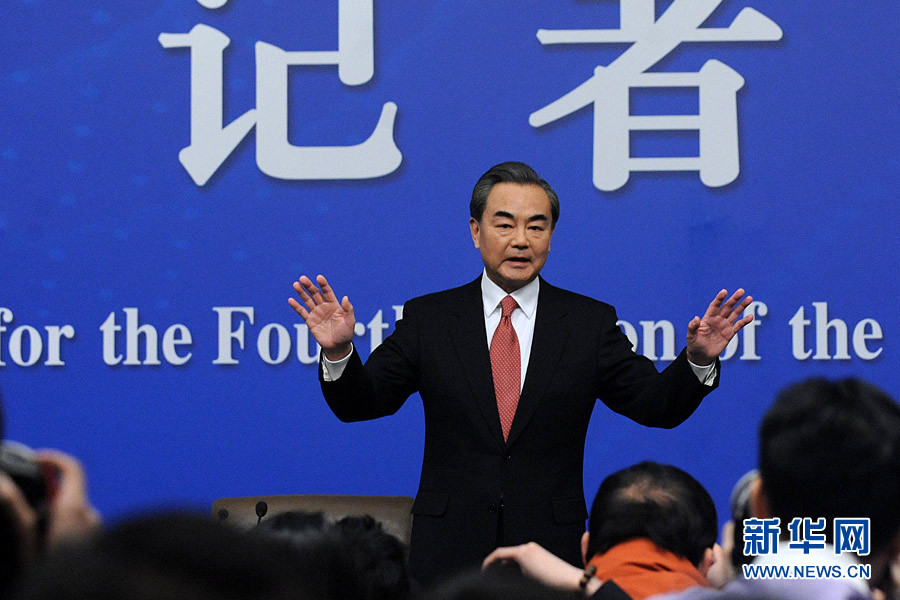 十二届全国人大四次会议新闻中心于3月8日(星期二)10时在梅地亚中心多功能厅举行记者会,邀请外交部部长王毅就“中国的外交政策和对外关系”的相关问题回答中外记者的提问。图为外交部部长王毅与记者打招呼。新华网发 陈竞超摄