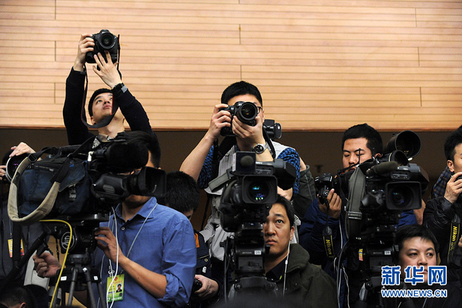 十二届全国人大四次会议新闻中心于3月8日(星期二)10时在梅地亚中心多功能厅举行记者会,邀请外交部部长王毅就“中国的外交政策和对外关系”的相关问题回答中外记者的提问。图为现场记者紧张地工作。新华网/中国政府网记者 陈竞超摄