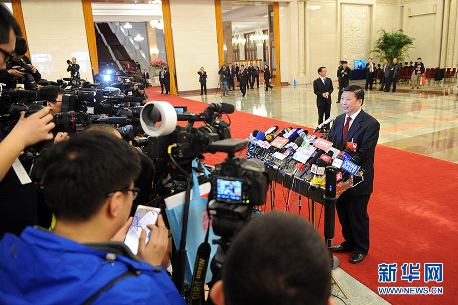 3月9日下午3时,第十二届全国人民代表大会第四次会议在人民大会堂举行第二次全体会议,听取全国人大常委会委员长张德江关于全国人民代表大会常务委员会工作的报告,听取全国人大常委会副委员长李建国关于中华人民共和国慈善法草案的说明。图为国土资源部部长姜大明在“部长通道”接受记者采访。新华网/中国政府网 陈竞超 摄