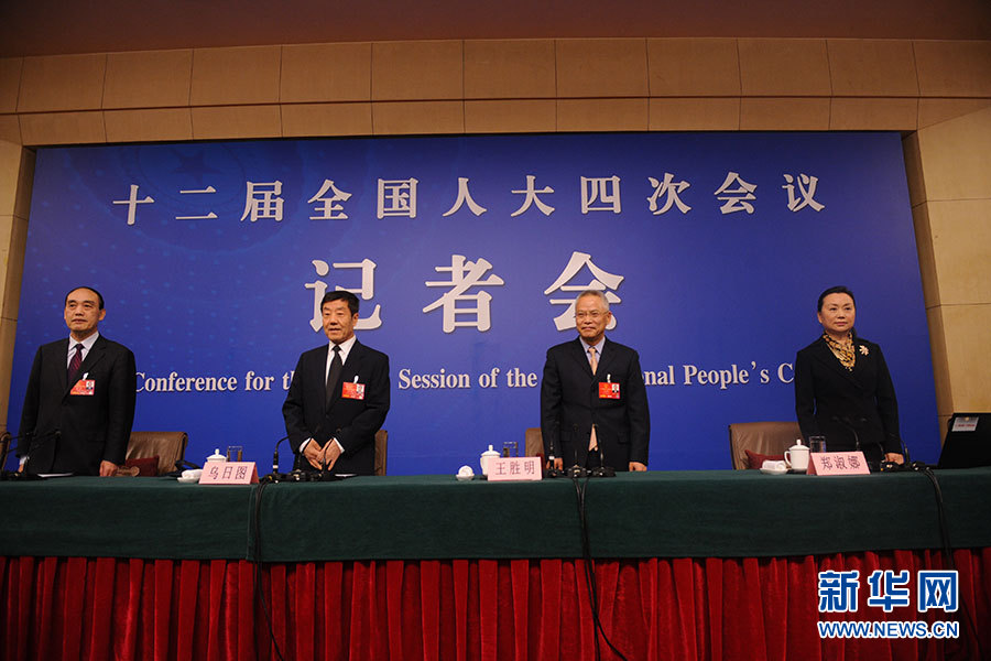 十二届全国人大四次会议新闻中心于3月10日(星期四)9时在梅地亚中心多功能厅举行记者会,邀请全国人大内司委副主任委员王胜明、全国人大财经委副主任委员乌日图、全国人大环资委副主任委员袁驷、全国人大常委会法工委副主任郑淑娜就“人大立法工作”的相关问题回答中外记者的提问。图为记者会现场。新华网/中国政府网 陈杰 摄