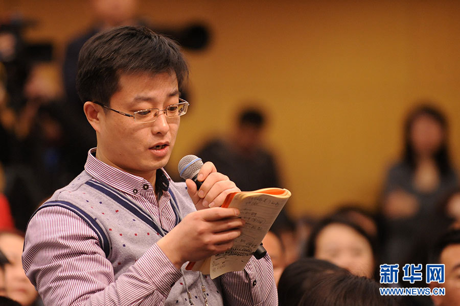 十二届全国人大四次会议新闻中心于3月10日(星期四)9时在梅地亚中心多功能厅举行记者会,邀请全国人大内司委副主任委员王胜明、全国人大财经委副主任委员乌日图、全国人大环资委副主任委员袁驷、全国人大常委会法工委副主任郑淑娜就“人大立法工作”的相关问题回答中外记者的提问。图为中国网记者提问。新华网/中国政府网 陈杰 摄
