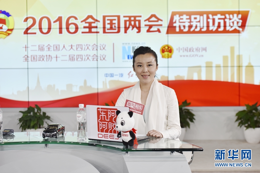 2016年3月12日,全国人大代表、正邦集团董事局主席、总裁林印孙做客新华网两会访谈直播间。图为新华网主持人张姣。新华网 郭小天 摄