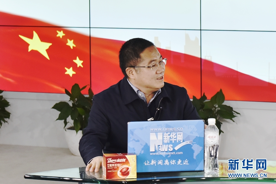 2016年3月12日,全国人大代表、正邦集团董事局主席、总裁林印孙做客新华网两会访谈直播间。图为林印孙在回答主持人提问。新华网 郭小天 摄