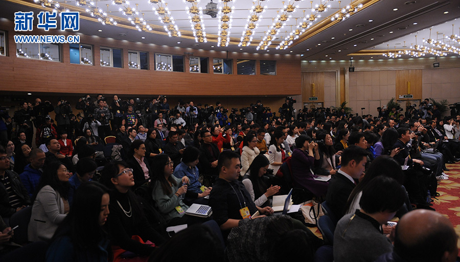 十二届全国人大四次会议新闻中心于3月12日(星期六)14时30分在梅地亚中心多功能厅举行记者会,邀请国务院国有资产监督管理委员会主任肖亚庆、副主任张喜武、副主任黄丹华和副秘书长、新闻发言人彭华岗就“国企改革”的相关问题回答中外记者的提问。图为座无虚席的记者会现场。新华网/中国政府网 陈杰 摄