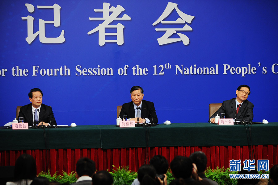 3月12日,十二届全国人大四次会议在梅地亚中心多功能厅举行记者会,邀请中国银行业监督管理委员会主席尚福林、中国证券监督管理委员会主席刘士余、中国保险监督管理委员会主席项俊波回答中外记者的提问。图为记者会主席台。新华网/中国政府网 陈杰 摄