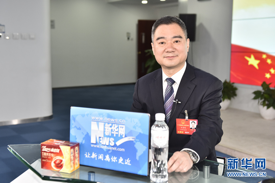3月12日,全国人大代表,运城市市长王清宪做客新华网2016全国两会特别访谈,与新华网网友在线交流。图为王清宪在访谈现场。新华网 付宇鹏 摄