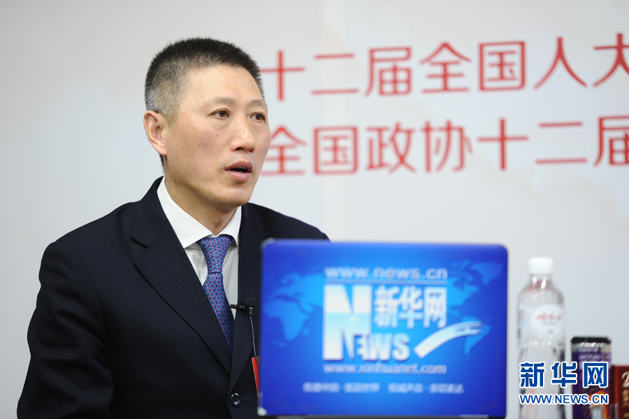 2016年3月13日,全国人大代表,烟台张裕葡萄酿酒股份有限公司总经理周洪江做客新华网两会访谈。图为周洪江在访谈现场。新华网 卢志佳 摄