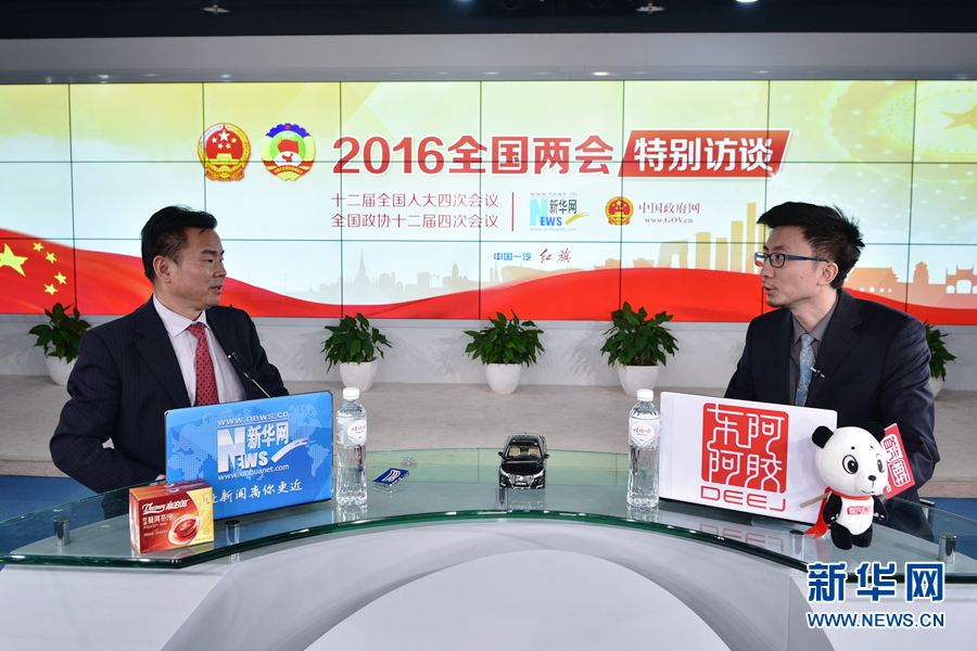 2016年3月13日,全国人大代表、海南省三沙市委书记、市政府市长肖杰做客新华网两会访谈直播间。图为肖杰回答主持人提问。新华网 郭小天 摄