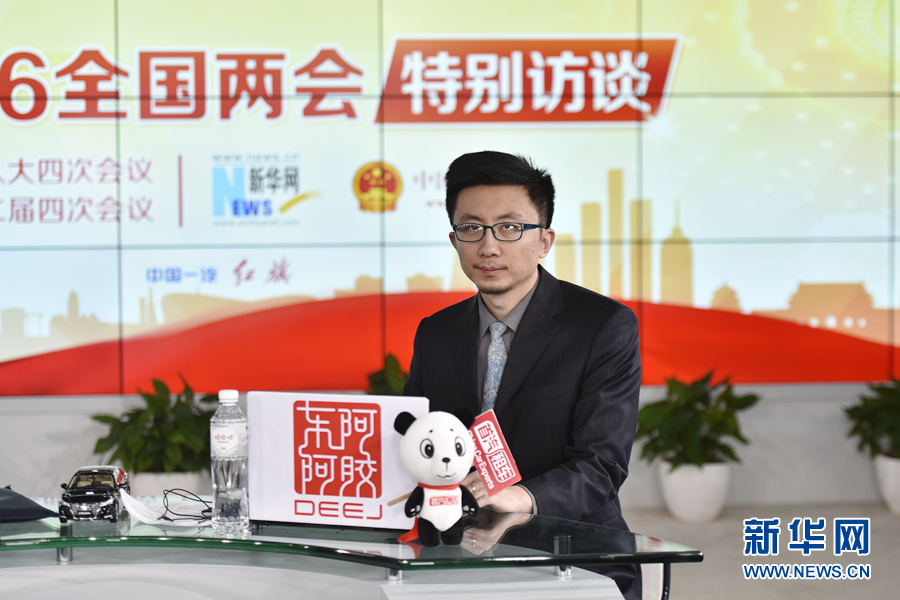 2016年3月13日,全国人大代表、海南省三沙市委书记、市政府市长肖杰做客新华网两会访谈直播间。图为主持人孙博。新华网 郭小天 摄
