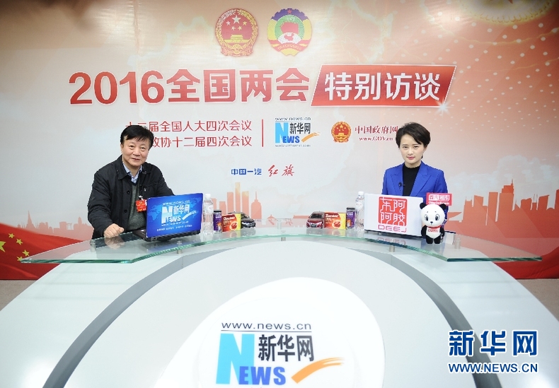 2016年3月14日,全国政协委员,天津达仁堂京万红药业有限公司总经理刘文伟做客新华网2016全国两会特别访谈,与新华网网友在线交流。图为刘文伟在访谈现场。新华网 贾海元 摄