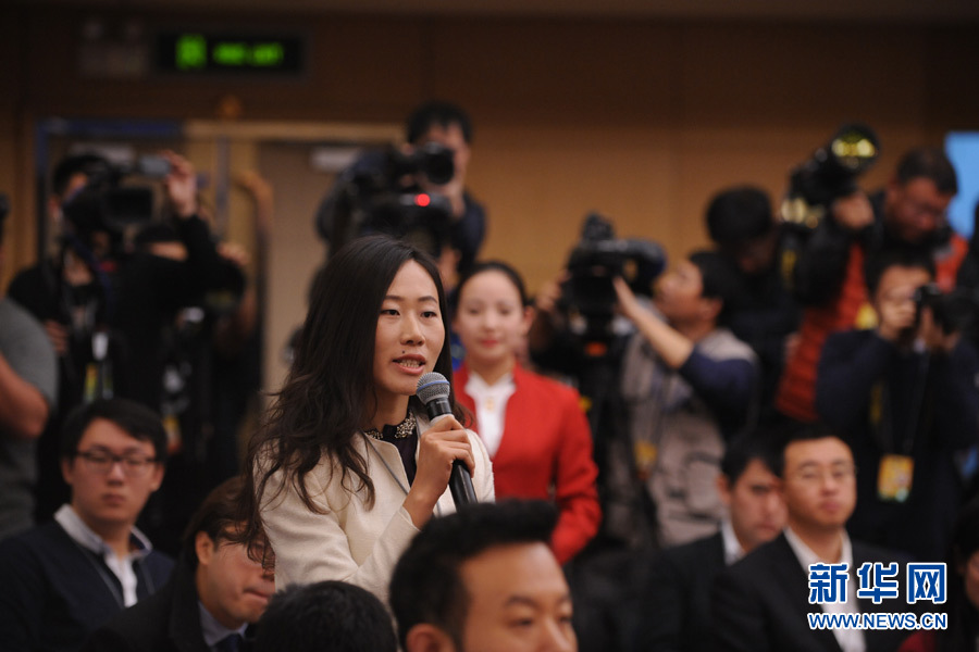十二届全国人大四次会议新闻中心于3月14日(星期一)10时在梅地亚中心多功能厅举行记者会,邀请交通运输部部长杨传堂、交通运输部运输服务司司长刘小明、北京交通发展研究中心主任郭继孚就“深化出租汽车改革与发展”的相关问题回答中外记者的提问。图为第一财经记者提问。新华网/中国政府网 陈杰 摄