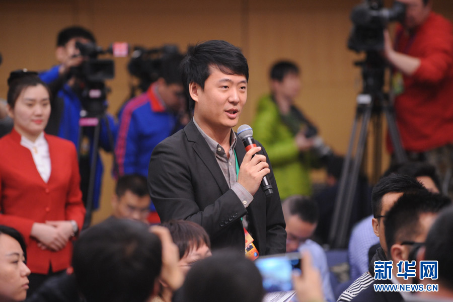 十二届全国人大四次会议新闻中心于3月14日(星期一)10时在梅地亚中心多功能厅举行记者会,邀请交通运输部部长杨传堂、交通运输部运输服务司司长刘小明、北京交通发展研究中心主任郭继孚就“深化出租汽车改革与发展”的相关问题回答中外记者的提问。图为新华社记者提问。新华网/中国政府网 陈杰 摄