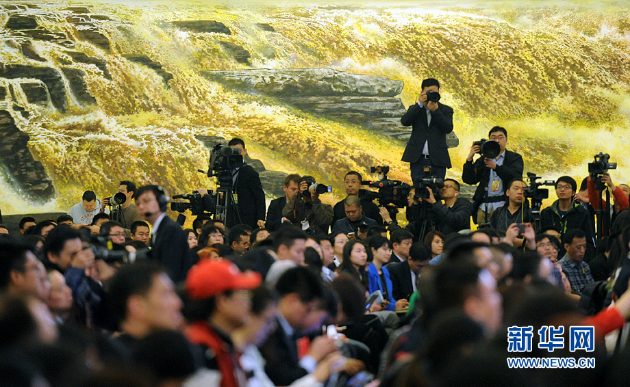 3月16日上午,国务院总理李克强在人民大会堂三楼金色大厅会见采访十二届全国人大四次会议的中外记者并回答记者提出的问题。图为记者会现场。新华网/中国政府网 陈竞超 摄