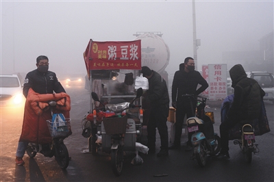 2016年12月22日早7时许,河北钢铁集团邯钢公司门口。工人在雾霾中戴着口罩买早餐。